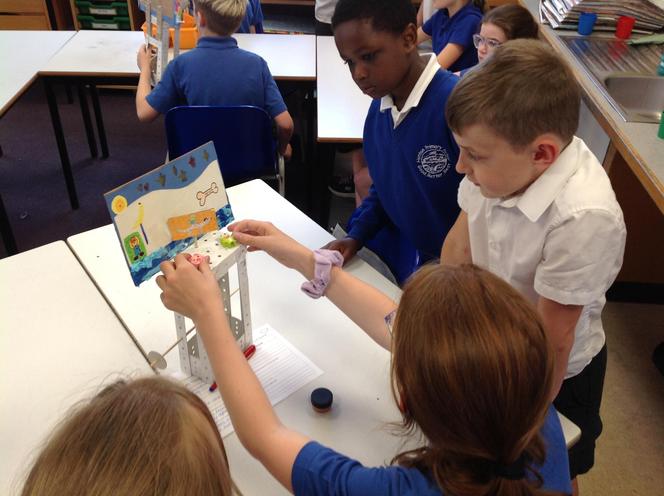 In Year 5, we have been very busy designing and making cam toys for Year 2. Yesterday, we shared our final products with Year 2. Take a look at the photos to see how they got on!